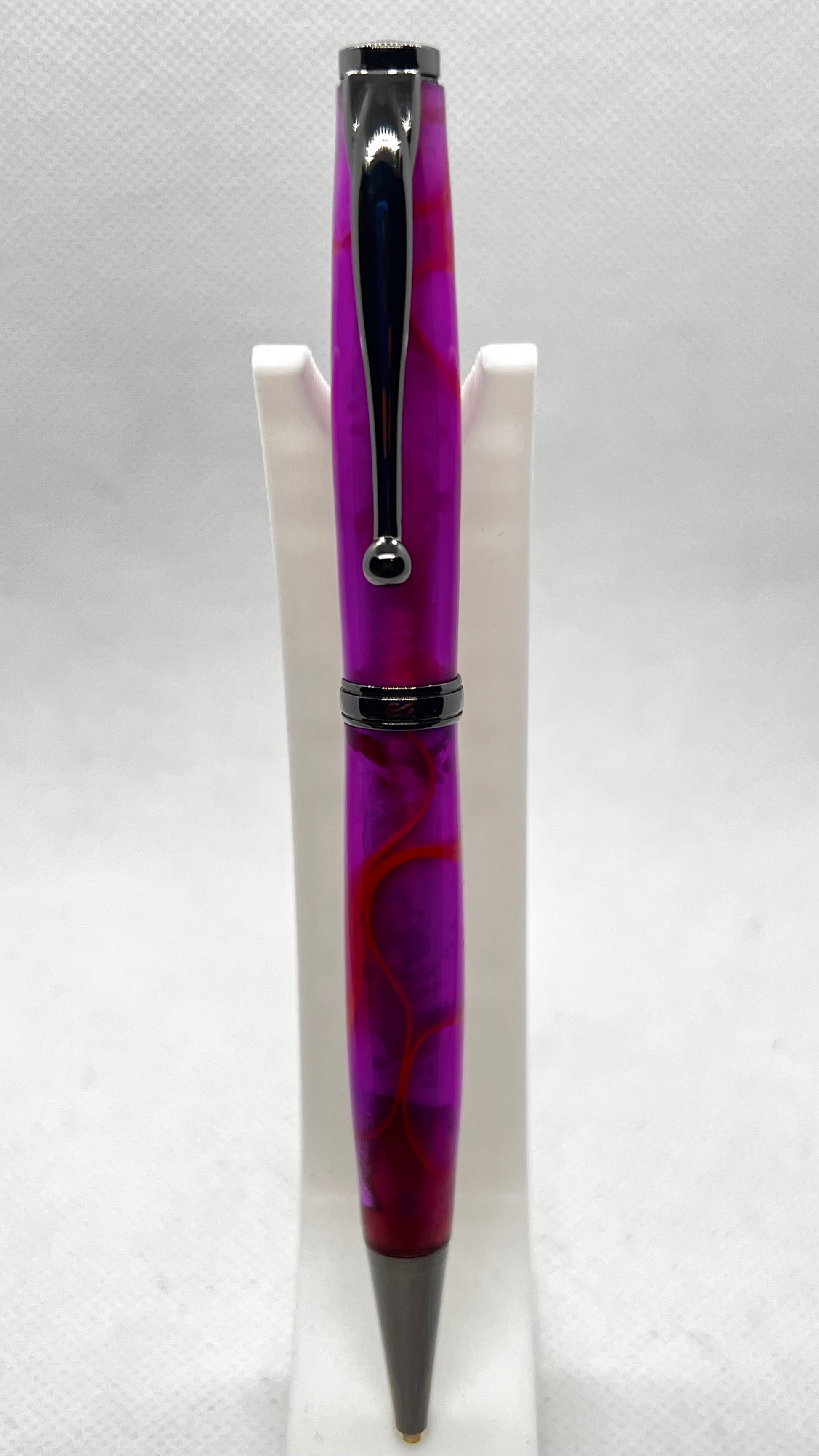 Our Purple Trimline Pen is a stunning addition to any writing collection. Hand-crafted with purple acrylic and gunmetal hardware, it offers both style and durability. Equipped with a replaceable ink cartridge, this pen is sure to last. Elevate your writing experience with our Trimline Pen.